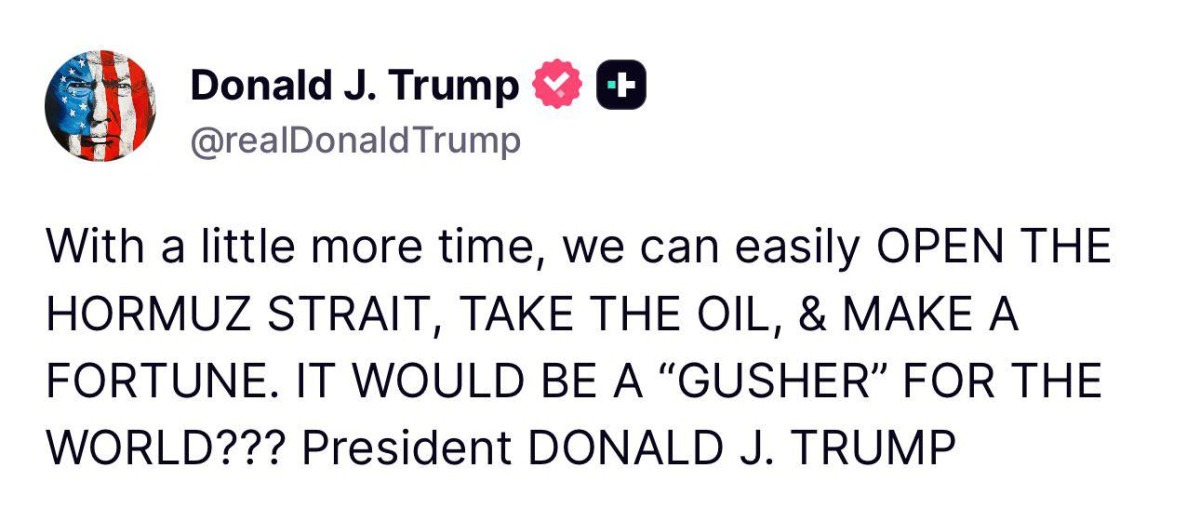 АҚШ президенті Donald Trump өзінің Truth Social әлеуметтік желісінде Ормуз бұғазы мен аймақтағы мұнай ресурстары туралы резонансты жазба жариялады, деп хабарлайды Azattyq Rýhy.