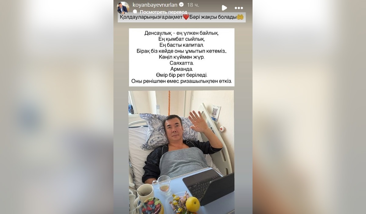 «Қолдауларыңызға рақмет. Бәрі жақсы болады. Денсаулық – ең үлкен байлық. Ең қымбат сыйлық, ең басты капитал. Бірақ, біз кейде оны ұмытып кетеміз. Көңіл күймен жүр. Саяхатта, арманда. Өмір бір рет беріледі. Оны ренішпен емес, ризашылықпен өткіз», - деп жазған Қоянбаев.