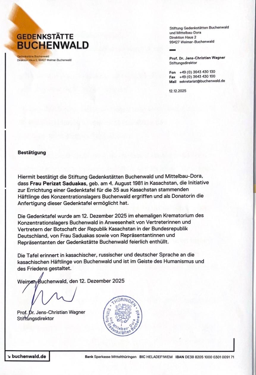 Өзінің жеке бастамасымен және жеке қаражатына тарихшы, тарих ғылымдарының кандидаты, Жоғарғы Соттың Коммуникациялар бөлімінің меңгерушісі Перизат Садуакас Германияда Бухенвальд концлагеріндегі қазақстандық тұтқындарға арналған ескерткіш тақтасын орнатты. Бұл жоба Ұлы Отан соғысы кезінде нацистік режим тұтқынына түскен жерлестерімізді есте сақтау мақсатында іске асырылды, деп хабарлайды Azattyq Rýhy.