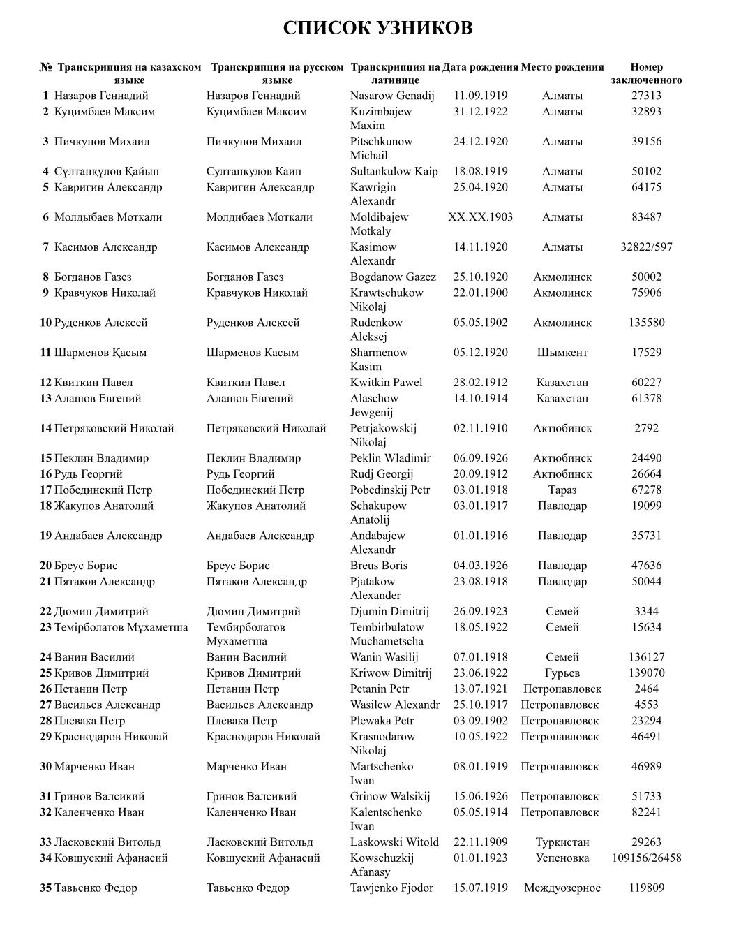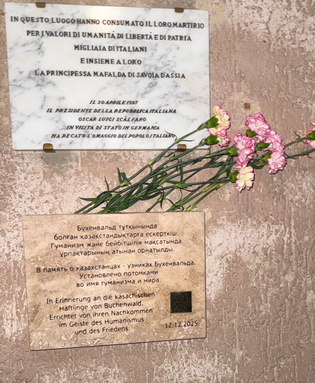 Ескерткіш тақта Бухенвальдтың бұрынғы крематорий ғимаратында – лагерьдің ең қайғылы орындарының бірінде есте қалған зорлық-зомбылықтың символы. Тақтада алғаш рет QR-код қолданылған, ол кез келген туристке қазақстандық тұтқындардың тізімін қазақ, орыс және неміс тілдерінде көруге мүмкіндік береді. Тізімде 35 қазақстандық көрсетілген, олар Алматы, Ақтөбе, Тараз, Шымкент, Павлодар, Петропавл, Семей қалалары мен Ақмола және Түркістан облыстарынан шыққан түрлі ұлт өкілдері. Ең жас тұтқын 1926 жылы, ең үлкені – 1900 жылы туған. Тізімді толықтыру және жаңарту жұмысы Бухенвальд әкімшілігінің қолдауымен жалғасады.