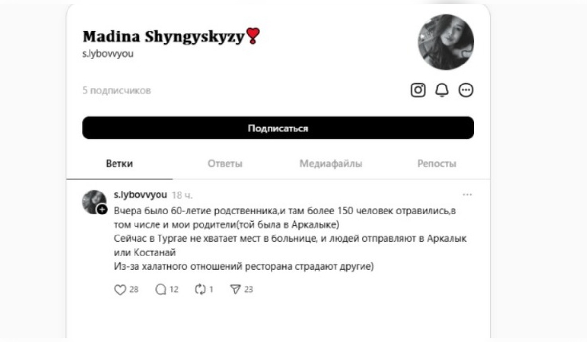 «Кеше Арқалықта туысымыздың 60 жылдық тойы болды. 150-ден астам адам уланды, арасында менің ата-анам да бар. Мейрамхана қызметкерлерінің салғырттығынан адамдар зардап шегіп отыр», – деп жазды Мадина Шыңғысқызы.