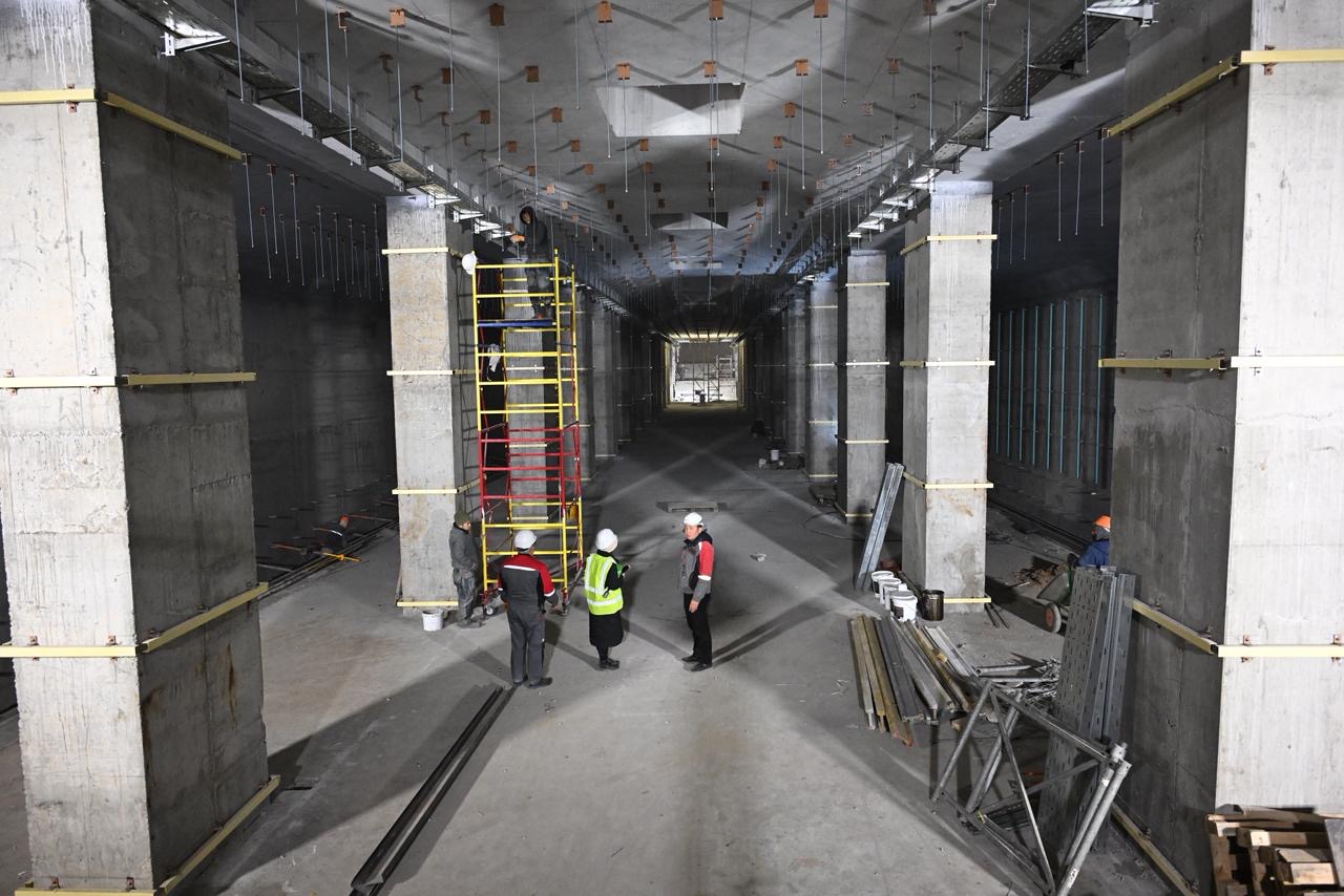 Станцияның өзінде монолиттік құрылымдар аяқталуға жақын, кері топырақ толтыру жүргізіліп жатыр. Ішкі кеңістікте әрлеу жұмыстары, инженерлік коммуникациялар тарту және жабдықты монтаждауға дайындық жүріп жатыр. Барлық өндірістік операциялар тәулік бойы атқарылады. Жалпы нысанда 478-ден астам маман еңбек етуде: оның 149-ы жерасты жұмыстарында, 329-ы – ашық алаңдарда.