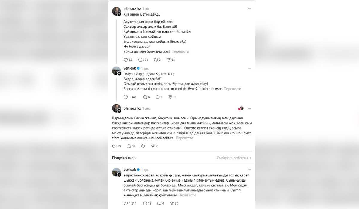«Осылай жазылған негізі, тағы бір тыңдап аласыз ау. Басқа әндердің мәтінін оқып көріңіз, бұлай ішіңіз ашымас. Өтірік тілек жазбай ақ қойыңызшы, менің шығармашылығымды толық қарап шыққан болсаңыз, бұлай бір әніме қадалмайтын едіңіз. Осылай бастасаңыз да болар еді. Мысқылдап, кекете алмай-ақ. Мен сіздің айтыстарыңызды көріп, шығармашылығыңызды сыйлайтынмын. Бүйтіп жаныңыз ашымай-ақ қойсыншы», - деп жауап берді әнші.