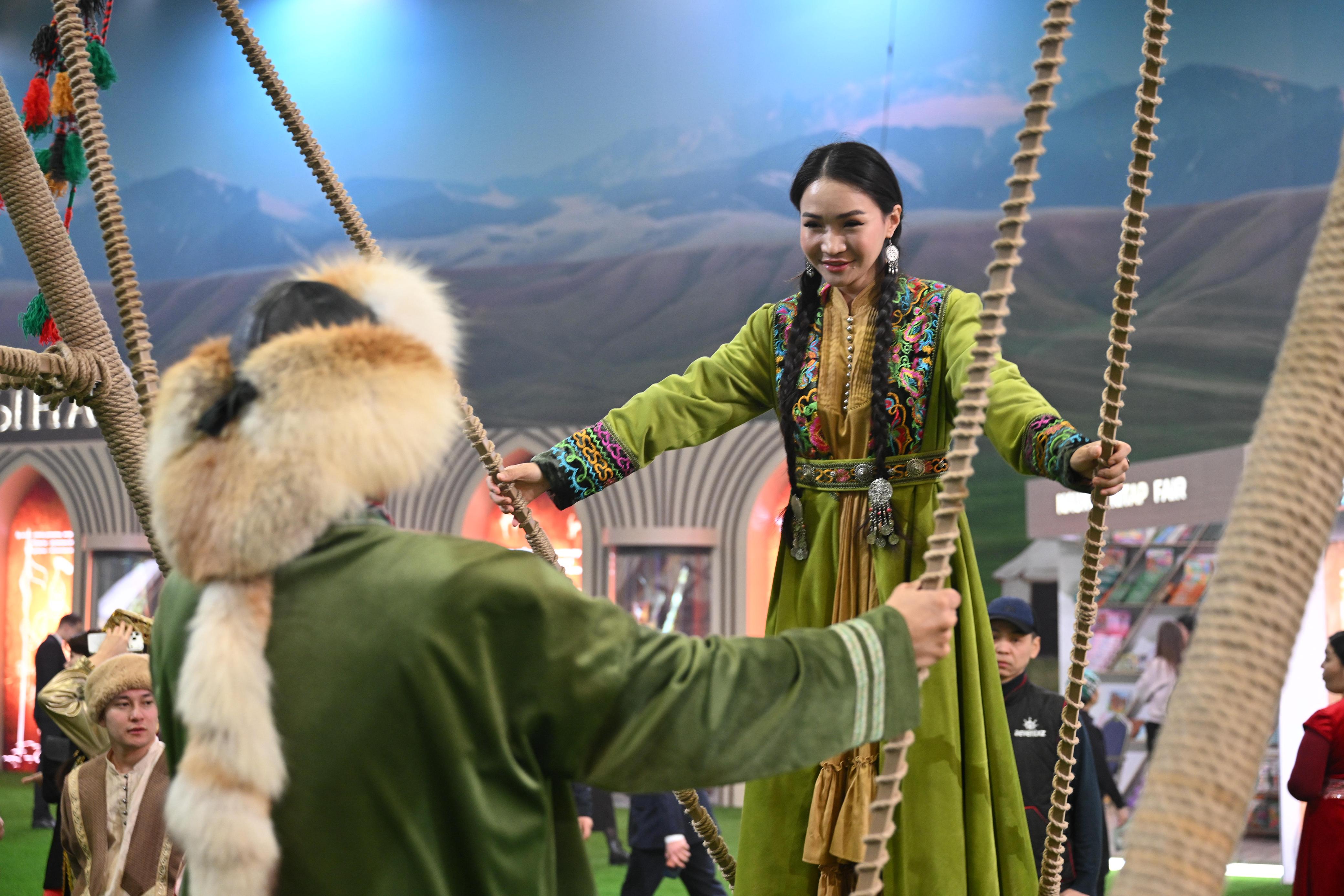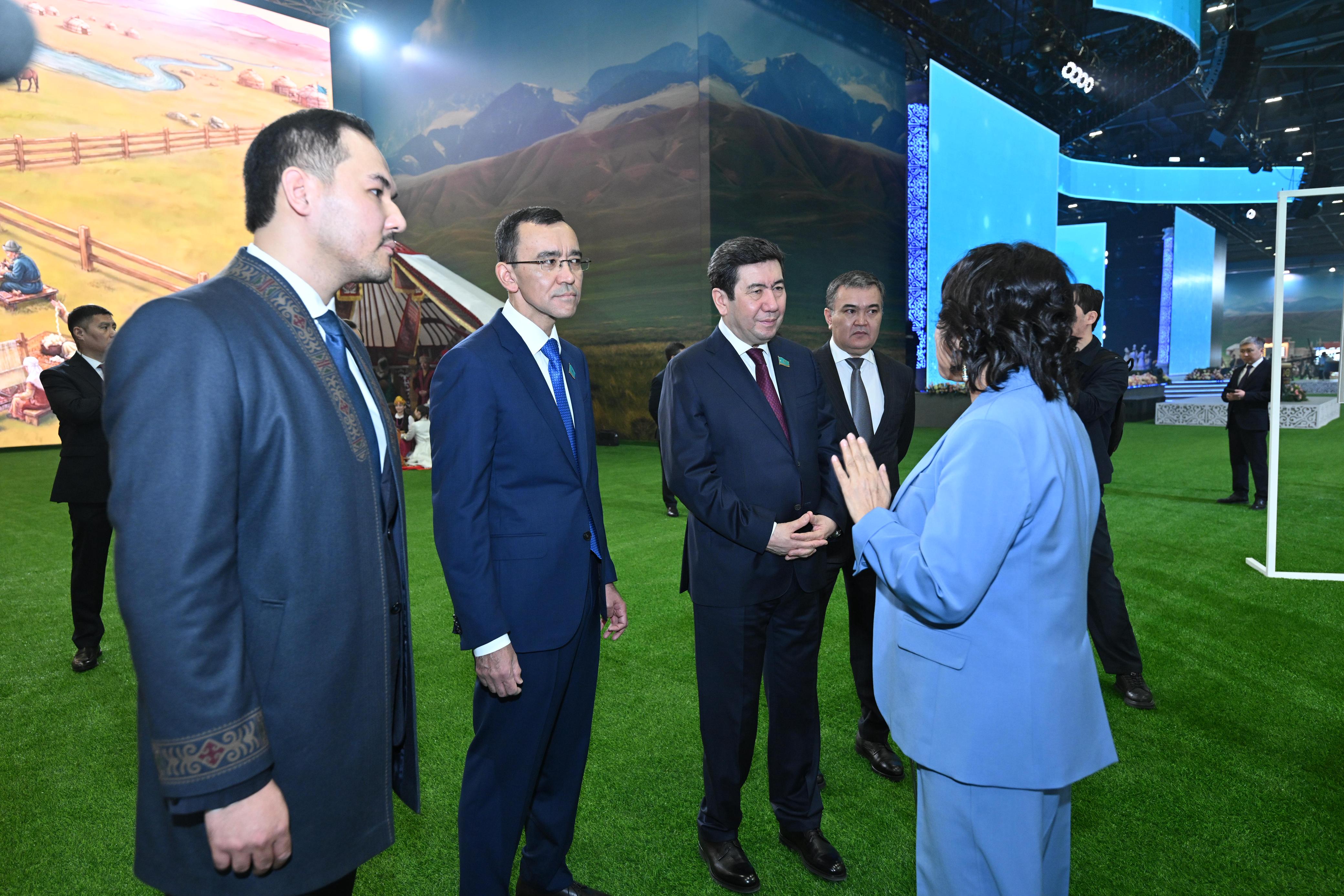 Парламент палаталарының басшылары «EXPO» халықаралық көрме орталығының аумағында орналасқан Этноауылға барды. Олар мерекелік іс-шараларға қатысушылармен әңгімелесіп, қазақ халқының ұлттық құндылықтары туралы сыр шертетін «Жеті Қазына» голографиялық көрмесін тамашалады.