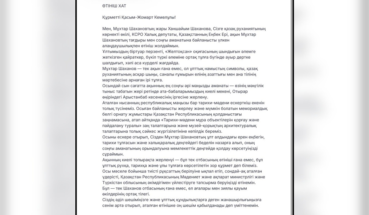 «Сізден Мұхтар Шахановтың ұлт алдындағы ерен еңбегін, тарихи тұлғасын және халықаралық деңгейдегі беделін назарға алып, оның соңғы аманатының орындалуына мемлекеттік деңгейде қолдау көрсетуіңізді сұраймын», - деген хат авторы.