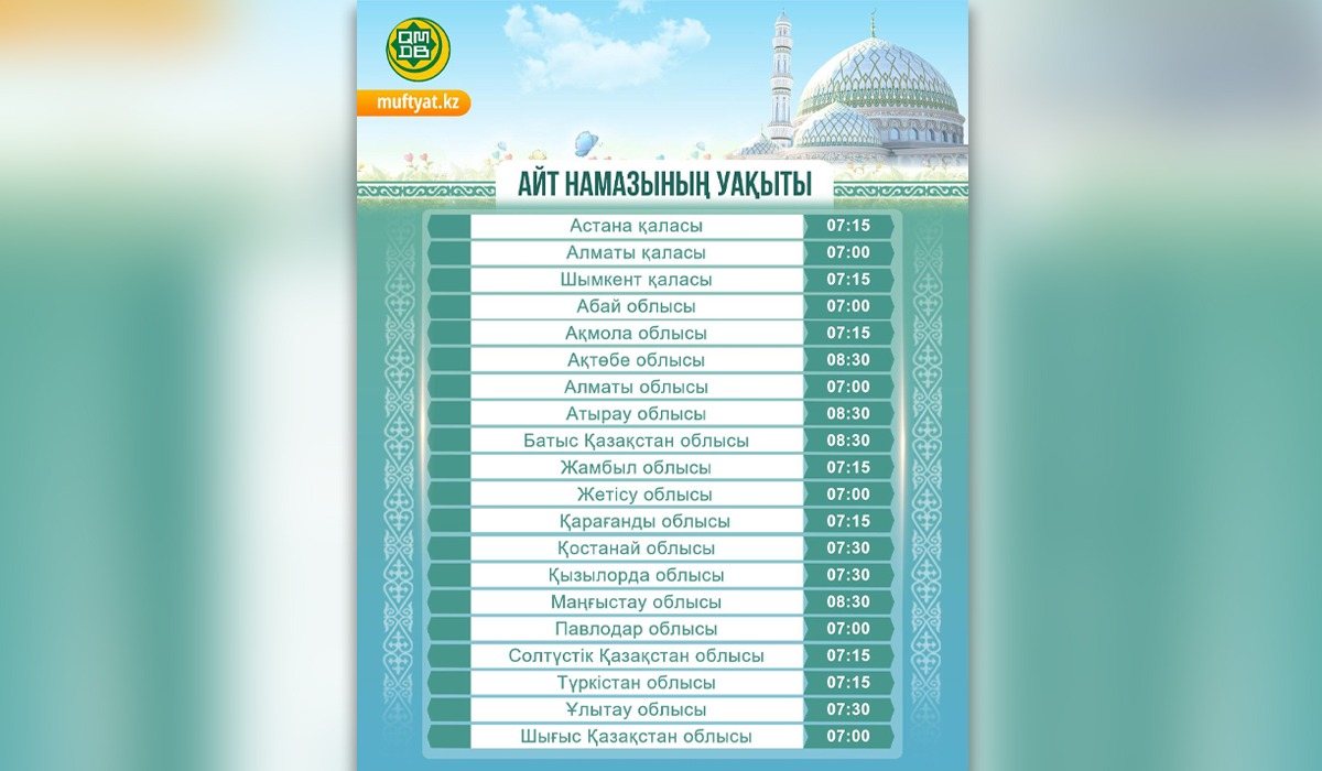Айт намазы бірнеше өңірде 07.00-де, ал кейбір өңірде 08.30-да басталады.