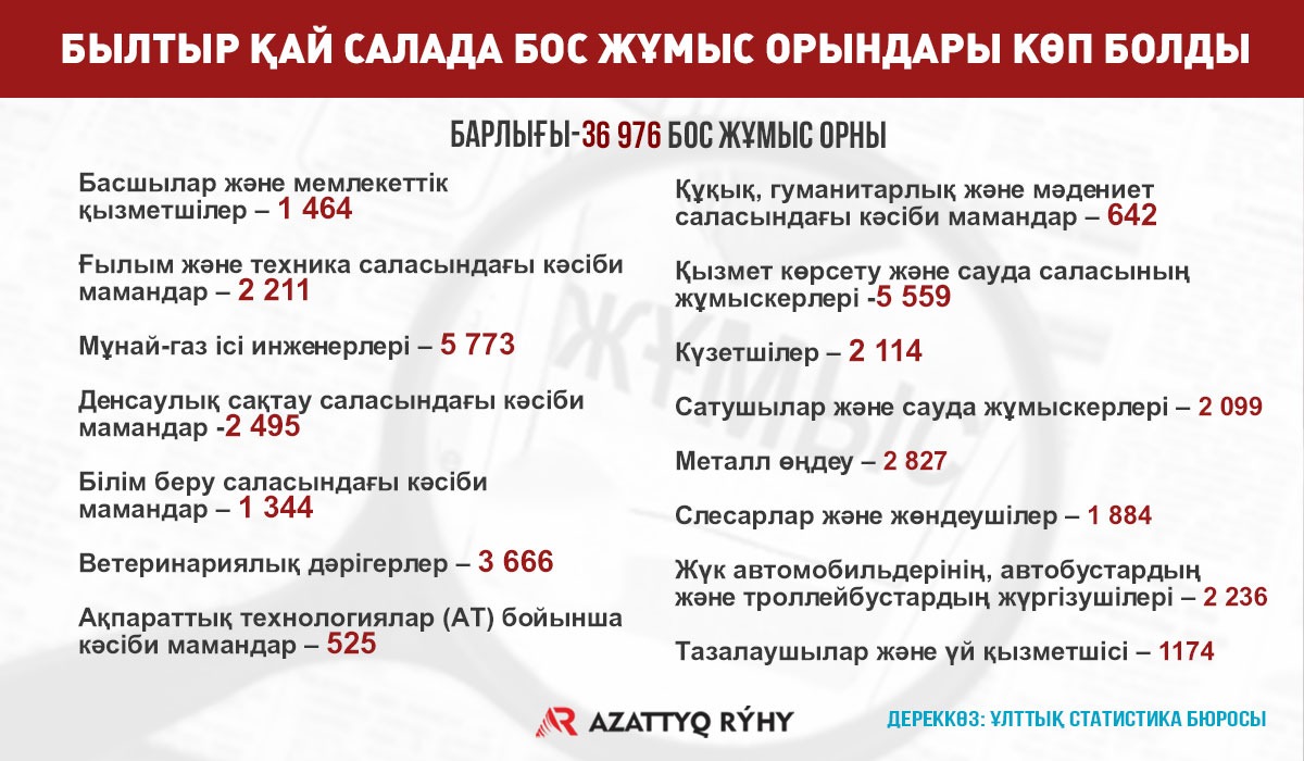 Ұлттық статистика бюросының мәліметінше 2021 жылы республика бойынша барлығы 36 976 бос жұмыс орны тіркелген. Оның ішінде бос басшылар және мемлекеттік қызмет орындарының саны – 1 464. Бұл ретте, өндіріс және арнайы сервистік қызметтер саласындағы корпоративтік сектордағы мамандырылған бөлімшелердің басшыларына сұраныс жоғары. Былтыр бұл санатта 820 бос жұмыс орны болған. Елімізде сонымен қатар, мұнай-газ ісі инженерлері бойынша 5 773 бос жұмыс орны бар. Әлеуметтік салаларға жататын денсаулық сақтау саласында 2 495, білім беру саласында 1 344 бос жұмыс орны тіркелген. Ең көп жұмыс орны қызмет көрсету және сауда саласының жұмыскерлеріне тиесілі – 5 559 орын, келесі кезекте күзетшілер – 2 114 орын, сатушы мен сауда жұмыскерлері – 2 099 орын, жүк автомобильдерінің, автобустардың және троллейбустардың жүргізушілері – 2 236 бос жұмыс орны тіркелген.