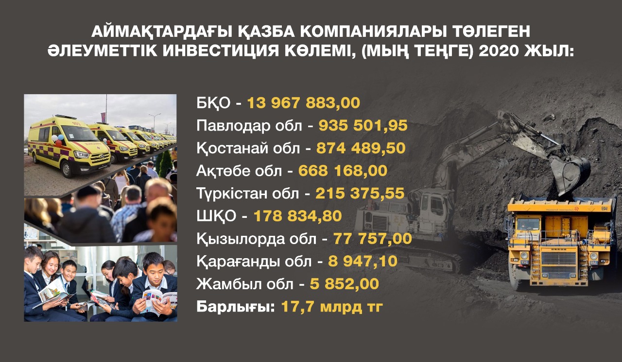2020 жылы аймақтардағы жер байлығын игеретін компаниялар 17,7 млрд теңге көлемінде әлеуметтік инвестиция төлеген, оның ең көбі – Батыс Қазақстан облысына тиесілі.